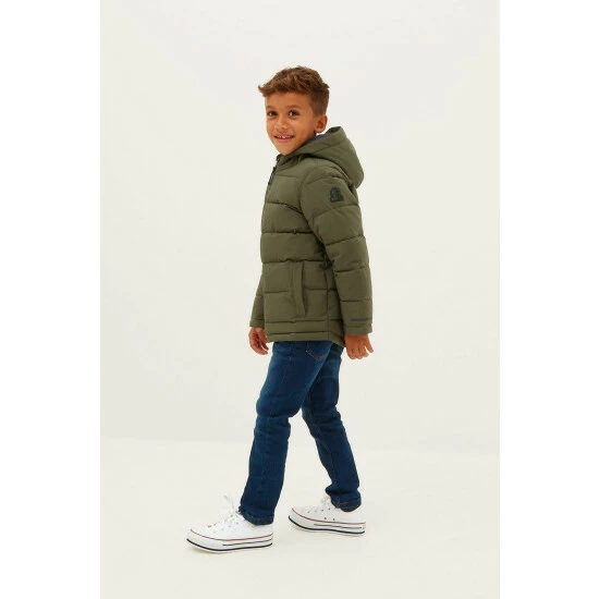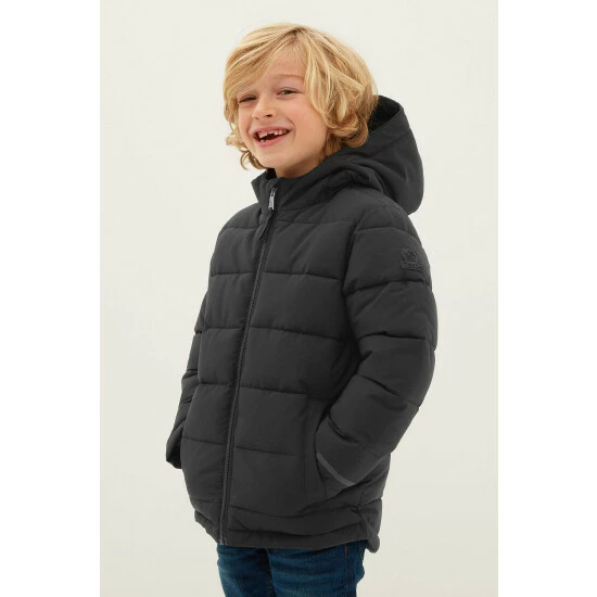 Super warm and wind resistant, our Harecroft premium quilted jacket for boys stands up to adventures outdoors on the coldest days and makes a great school coat too. Designed in West Yorkshire, this coat is quilted in chunky baffles and has a warm, insulated filling and two lower pockets that double up as hand warmers. It has a fixed, insulated hood with a Vecro adjuster tab at the back, so it can be shaped around the face to keep the wind at bay.