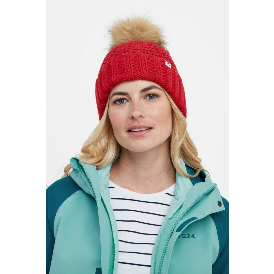 Knitted winter hat with box stitch knit pattern, faux fur pompom and folded label branding