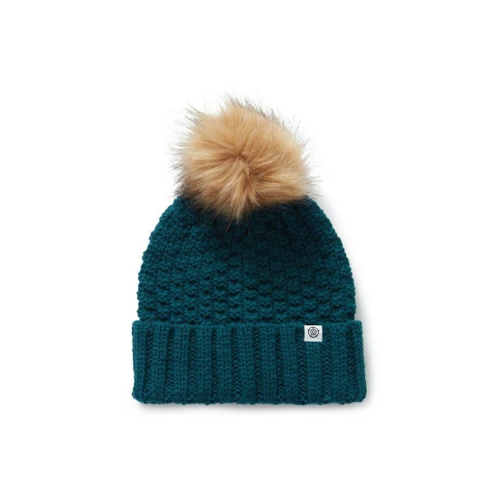 Knitted winter hat with box stitch knit pattern, faux fur pompom and folded label branding